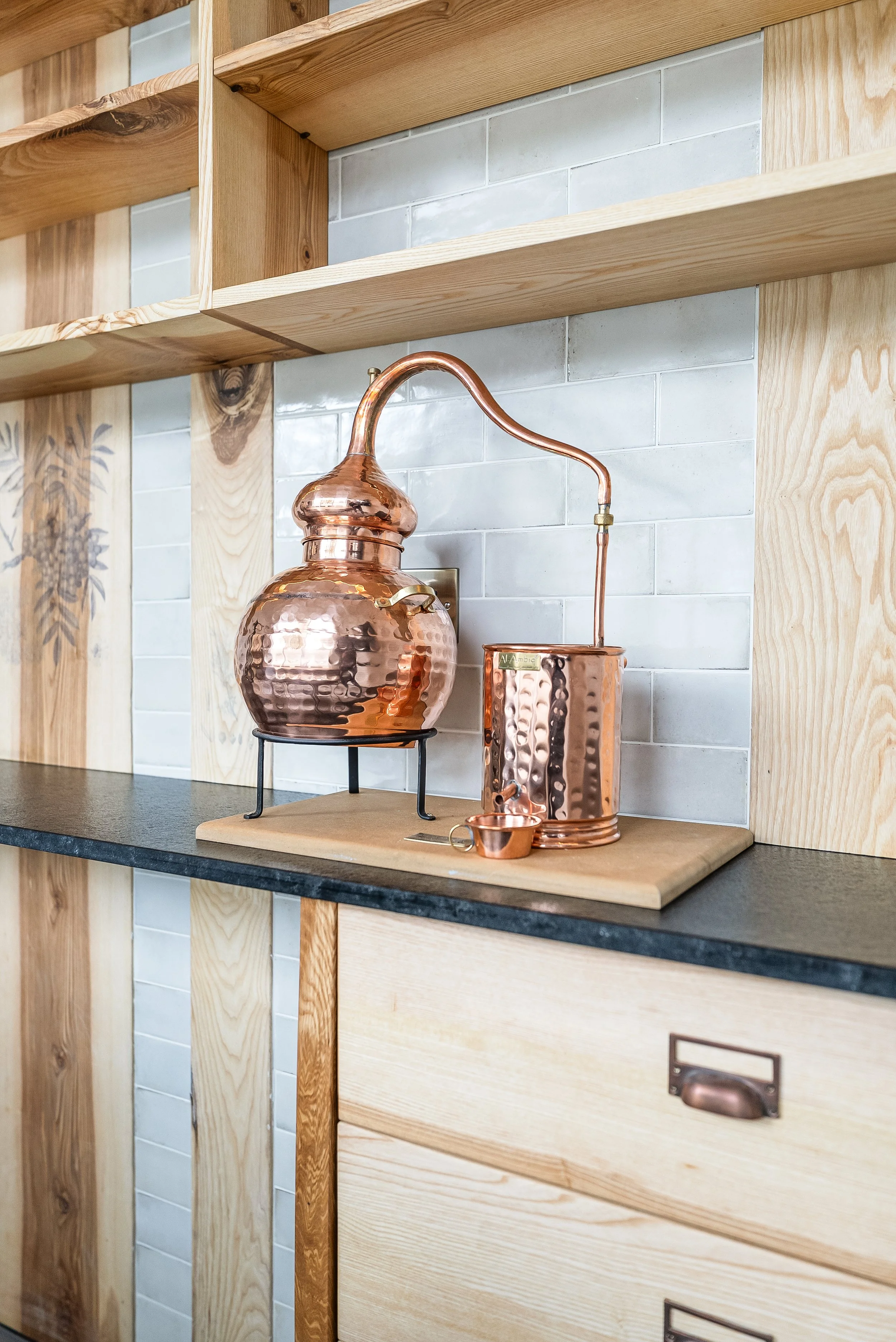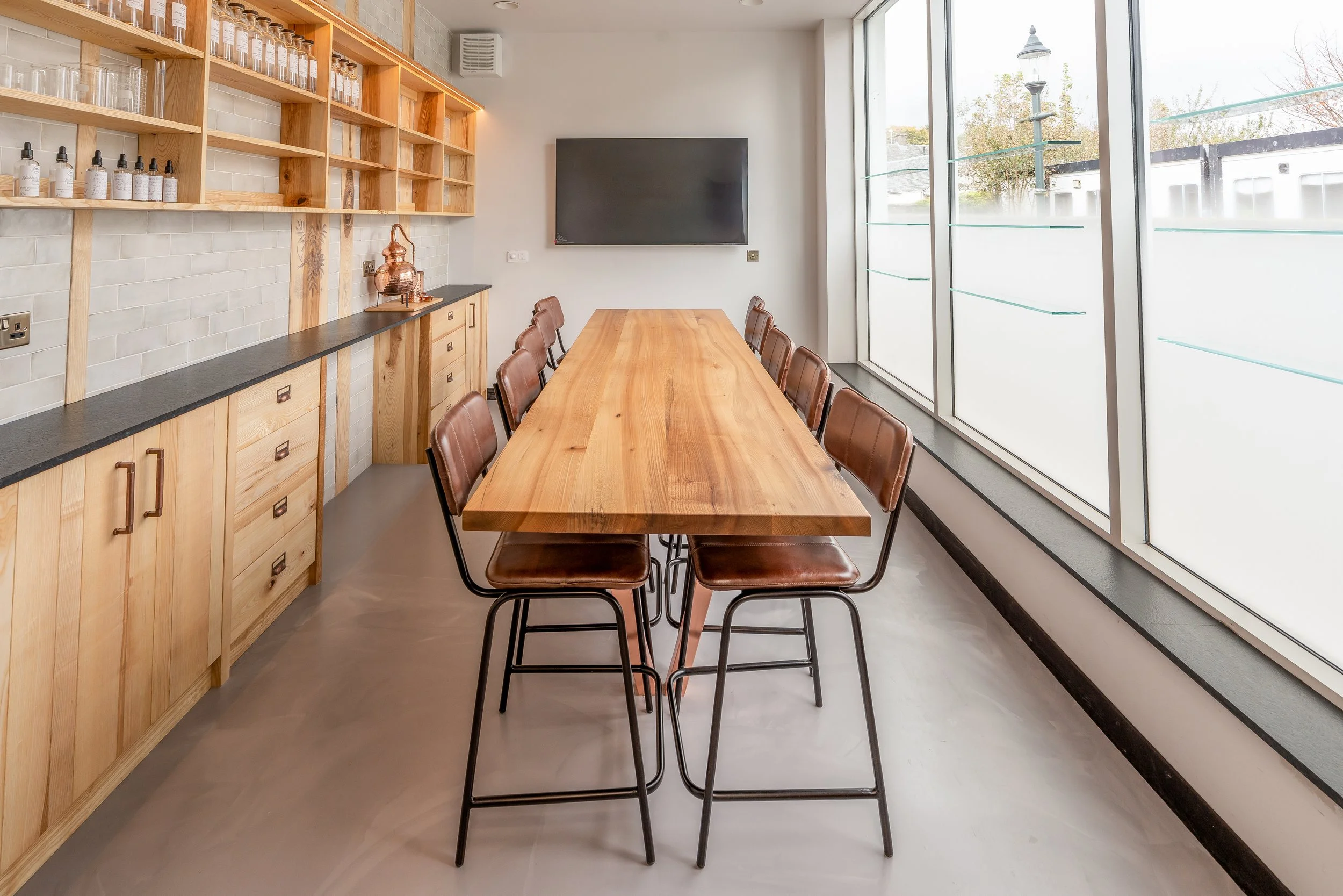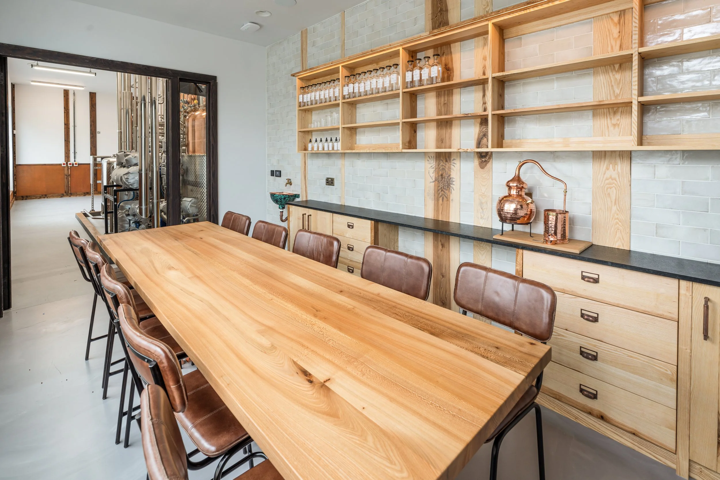 We reimagined the existing buildings to house the new gin still, and in doing so, pushed the structural boundaries of the space. The new atrium roof proudly features timbers reclaimed from the 100-year-old Fergusons Chocolate Factory in Cathcart - just a stone’s throw from our Glasgow workshop - continuing the story of Scottish material heritage and craft.